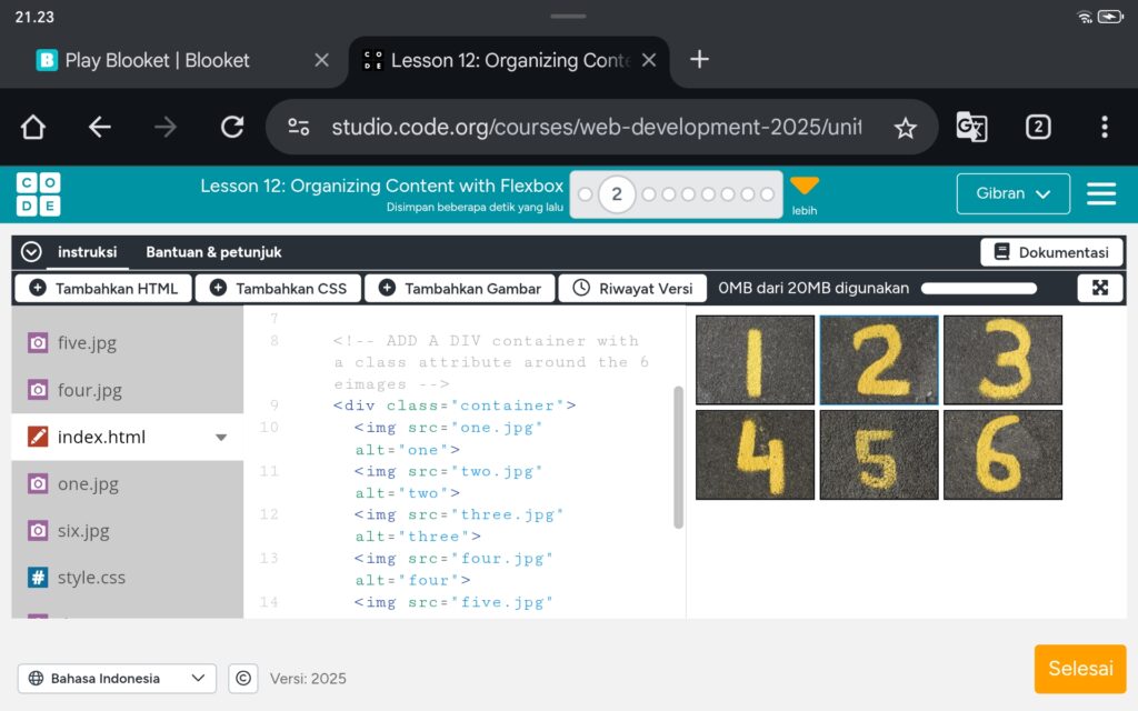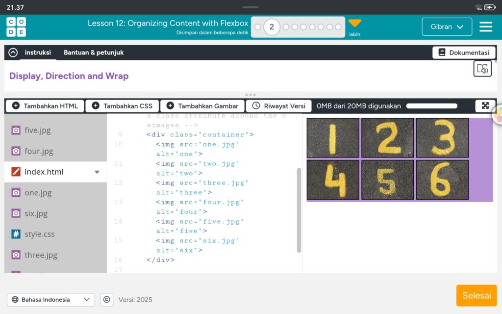 Menjadi seperti ini,dan ikuti code² seperti d atas supaya sama dan benarLanjut ke nomor 3 di sini kita d perintahkan untuk menambahkan properti justify conten ke setiap 6 kontainer div di stylesheetYang awalnya seperti ini